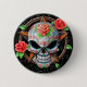 Dieser verwickelte Zuckerschädelentwurf sitzt auf einen Stern mit fünf Punkten, der durch einen großen Kreis gerahmt ist. Der Schädel wird mit Wirbel und Punkte sowie eine große Rose und Blätter mitten in der Stirn verziert. Empfindliche Reben spinnen ihre Weise um den äußeren Kreis mit zwei Rosen, die auf beiden Seiten erscheinen. Der Schädel sitzt auf einem reinen schwarzen Hintergrund, der diesem Knopf einen schönen Kontrast gibt. Dieser herrliche Tag des toten Zuckerschädels macht ein aggressives und stilvolles Muster.