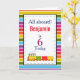 Farbenfroher Cartoon Spielzeugzug. Vorlagen, um den Namen, das Alter und die Nachricht des Kindes hinzuzufügen. Mehrfarbiger Regenbogen-Streifen Hintergrund.