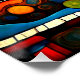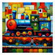 Der A.I.Assisted Print eines Kindes im Vordergrund zeigt eine lebendige, farbenfrohe Szene mit einem skurrilen Zug, in dem Kinder vor dem Hintergrund geometrischer Gebäude aus den Fenstern austreten.