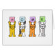 Vier Cartoon Katzen mit verschiedenen farbigen Buchstaben, die "ZUHAUSE" ausdrücken.
