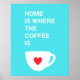 Eine weiße Tasse mit rotem Herzen liegt auf einem türkisfarbenen Hintergrund. Das Sprichwort "Zuhause ist dort, wo der Kaffee ist" erinnert uns daran, dass es, solange es Kaffee gibt, etwas gibt, wofür man dankbar sein kann!
