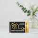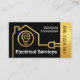Ein komplett schwarzes Cover verfügt über eine goldene Zuhause-Stromkreiskonstruktion mit dem Power-Stecker, der an eine goldene Schicht mit Kontaktdaten angeschlossen ist. An der oberen Ecke befindet sich Ihr Name mit den Kontaktdaten in der Nähe der Basis. Innerhalb der Zuhause-Schaltung ist ein goldenes Glühbirnen-Logo mit Reparaturwerkzeugen, die Sie verwenden können. Hinter dem Blatt befinden sich die Kartendetails in der Mitte mit dem goldenen Logo oben. Danach folgen der Firmenname, die Kontaktdaten und ein Slogan, den Sie ändern können. Eine großartige Karte für Elektriker.