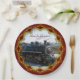 Papier Teller mit einem altmodischen Zug mit einem schneebedeckten Berg im Hintergrund Zuhause für Weihnachten.