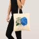Blaue Hydrangeas personalisiert Tote Tasche mit Namensvorlage. Eine hellblaue Blume und eine hellblaue Blume schmücken eine Seite dieses Stoffbeutels, mit Optionen für die Grifffarbe. Oder wählen Sie einen anderen Stil.