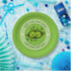 Zusammen in einer grünen Hülle sind zwei bezaubernde Erbsen. Jede Erbse hat Augenpunkte und ein fröhliches, freche Lächeln. Um die Hülle herum liegen Weinberge und grüne Blätter. Das Design ist Set in einem grünen Kreis. Um den Rand, oben und unten sind Vorlagen, um Ihren eigenen Text hinzuzufügen. Der Hintergrund ist grün mit winzigen Polka-Punkten.