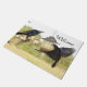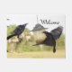 Eine Fußmatte mit einer Fotografie von zwei Grackle Vögeln oder Krähen, die um eine Vogelzufuhr fliegen. Das Wort Willkommen kann zum unterschiedlichen Wort gelöscht werden oder geändert werden. Diese Fotografie ist durch mich, der Fotograf urheberrechtlich geschützt.