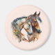 Magnet mit einem Bild mit einem Paar Pferde. Tragen dekorativer Headbands. Umgeben von Federn und Blättern.