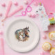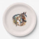 Papier Teller mit einem Bild mit einem Pferdepaar. Tragen dekorativer Headbands. Umgeben von Federn und Blättern.