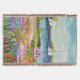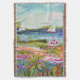 Zwei Segelboote und Hütte I von Karen Fields. Helle, lustige Szene mit Blume, Bäumen, einer Hütte und Segelbooten auf dem Wasser.