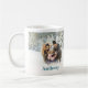 Fügen Sie Ihre eigenen Fotos zu einem besonderen personalisierten Geschenk. Diese Tasse kann mit zwei Fotos angepasst werden. Es gibt einen Platz, um einen auf der links Seite und einen anderen auf der rechten Seite hinzuzufügen. Unter jedem Foto befindet sich ein Ort, um einen eigenen Text in fett aquamarinen blauen Buchstaben gegen ein antikes Elfenbein weißes Overlay hinzuzufügen.
