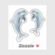 Dolphin-Aufkleber mit grauen, bodenlosen Delphinen. Beide Delfine sind aufrecht mit Schwänzen im Wasser stehend. Die Blätter sind in verschiedenen Größen erhältlich und können in Scrapbooks oder als Gastgeschenke von Kindern verwendet werden. Feiern Sie den Sommer oder den Geburtstag eines Kindes mit diesem lustigen Design.