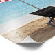 Das bunte Poster mit zwei Stühlen am Strand unter einem rot-weiß gestreiften Regenschirm mit Blick auf den Horizont.