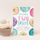 Niedliches Dessert Thema zweite Geburtstagsfeier Einladung "[Name] is two sweet" in der Mitte mit Ihren Party Details darunter, umgeben von Aquarellbilder in Neutronen, Rosa und Aqua.