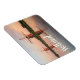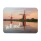 Rechteckiger Foto-Magnet mit zwei Windmühlen entlang eines Flusses mit Reflexion im Stillwasser im Sonnenuntergang auf einem Abend in den Niederlanden mit dem Text 'Holland'.