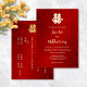 Diese elegante chinesische Hochzeitseinladung zeigt ein künstlerisch reales Goldfolie-Doppelglückssymbol auf einem blumenrubinroten Hintergrund. Braut und Bräutigam in einem eleganten, modernen, handgeschriebenen Skript. Mit einem Hintergrundtext auf Chinesisch.