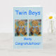 Zwei niedlichen kleine Teddybys mit blauen Bögen auf Gingham Hintergrund und der Text Twin Boys Vielen Glückwunsch!