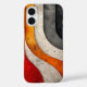 Dickige Ströme orangefarbener und roter Drehung über eine texturierte schwarze Kulisse, die einen Eindruck von zwei Sonnenstrahlen hinterlässt. Der Fall ist perfekt für diejenigen, die kühne, abstrakte Geometrie Liebe.