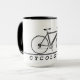 Radfahrer in weißem Text auf schwarz mit dunkelgrauem Fahrrad auf grauer Linie.